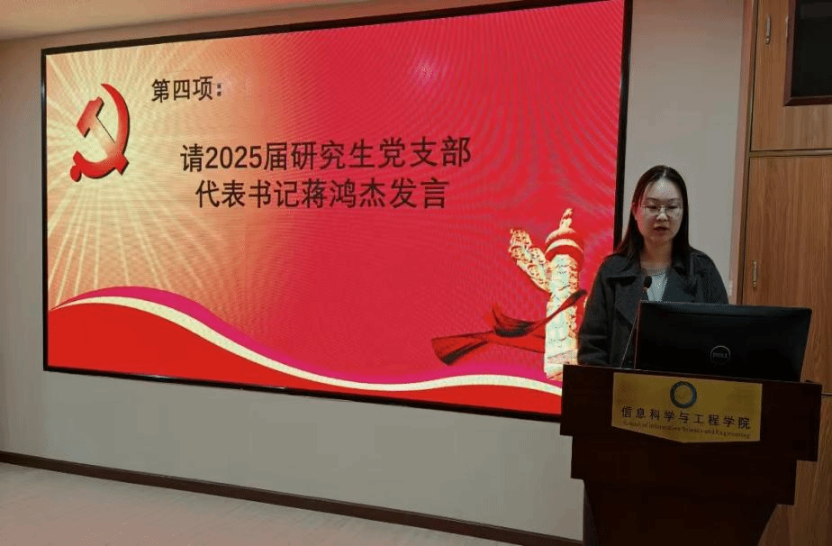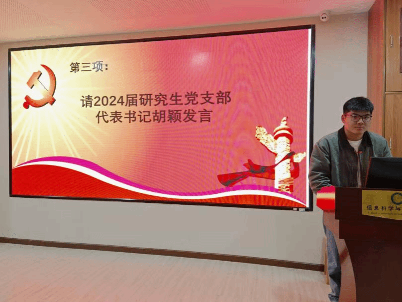 随后,2024届研究生党支部代表书记胡颖发言。胡颖回顾了过去一年党支部在组织建设、思想引领以及服务同学等方面的工作情况。他提到,在组织建设上,党支部通过开展形式多样的主题党日活动,增强了党员之间的凝聚力和向心力;在思想引领方面,积极组织党员学习党的理论知识,引导大家坚定理想信念,提高政治素养;在服务同学上,党支部发挥先锋模范作用,为同学们解决学习和生活中的实际困难,得到了同学们的广泛认可。胡颖表示,过去一年的成绩离不开全体党员的共同努力,同时也感谢学校和学院党组织的关心与支持。他希望新一届党支部能够继续发扬优良传统,不断创新工作方法,为党支部的发展注入新的活力。