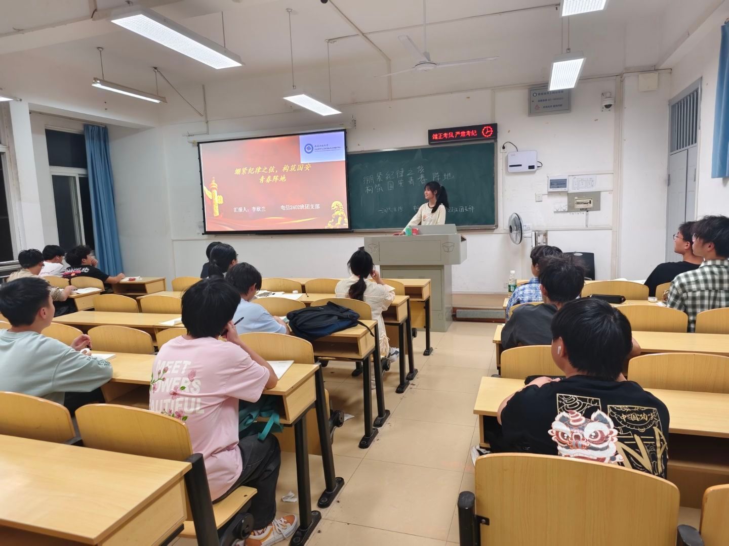 班会现场,班委们化身“法治讲师”,围绕《中华人民共和国宪法》《中华人民共和国治安管理处罚法》《民法典》中与大学生密切相关的内容展开讲解。从“宪法为何是国家根本大法”的深度解读,到“校园生活中涉及的民事权利与义务”的案例剖析,结合《学生手册》中关于学籍管理、纪律规范的章节,用“法律条文+校园实例”双轨并行的方式,让抽象法条变得通俗易懂。